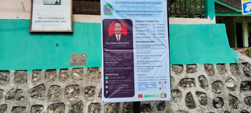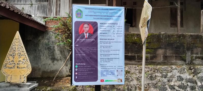 Sebagai wujud akuntabilitas dan transparansi penyelenggaraan pemerintahan, pembangunan kalurahan, pembinaan kemasyarakatan, pemberdayaan masyarakat, dan penanggulangan bencana, kondisi darurat, serta mendesak di Pemerintah Kalurahan Jerukwudel memasang banner informasi rencana anggaran pendapatan dan belanja kalurahan tahun anggaran 2026 di lokasi strategis agar dapat dilihat dan dipahami oleh warga masyarakat.