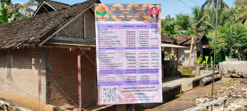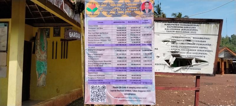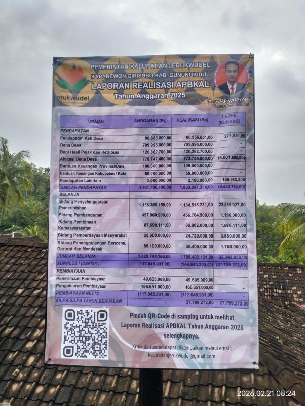 Sebagai bentuk transparasi dan akuntabilitas pengelolaan keuangan, Pemerintah Kalurahan Jerukwudel mempublikasikan realisasi APBKal tahun anggaran 2025 melalui pemasangan laporan pertanggungjawaban realisasi APBKal tahun anggaran 2025 pada papan publikasi di padukuhan-padukuhan. Publikasi ini merupakan ringkasan dari Peraturan Kalurahan Jerukwudel Nomor 1 Tahun 2026 tentang Laporan Pertanggungjawaban Realisasi APBKal TA 2025.